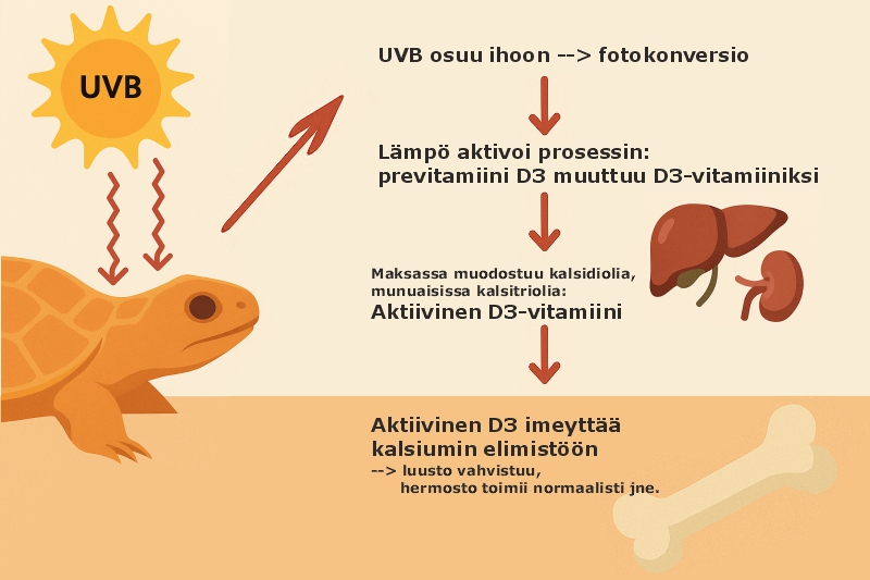 UVB-säteily (280–315 nm) on välttämätön D3-vitamiinin (kolekalsiferolin) muodostumiselle terraarioeläinten ihossa. Ilman UVB:tä matelija ei pysty tuottamaan riittävästi D3:a → kalsium ei imeydy → seurauksena voi olla vakavia luusto- ja hermosto-ongelmia.