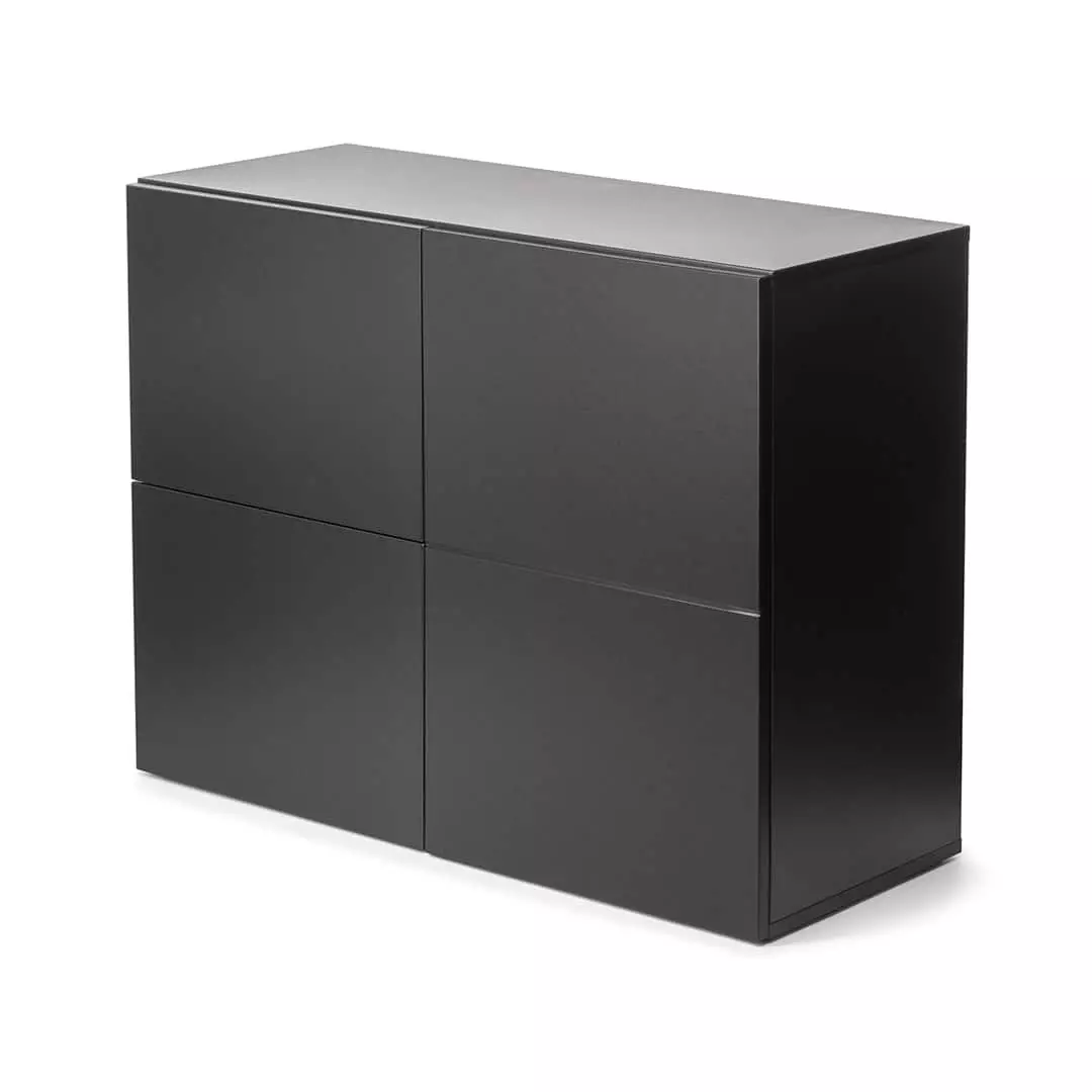 Kaapisto on kooltaan 100 x 40 x 78 cm Väri: Musta Jalustassa on kaksi ovea ja laatikosto.