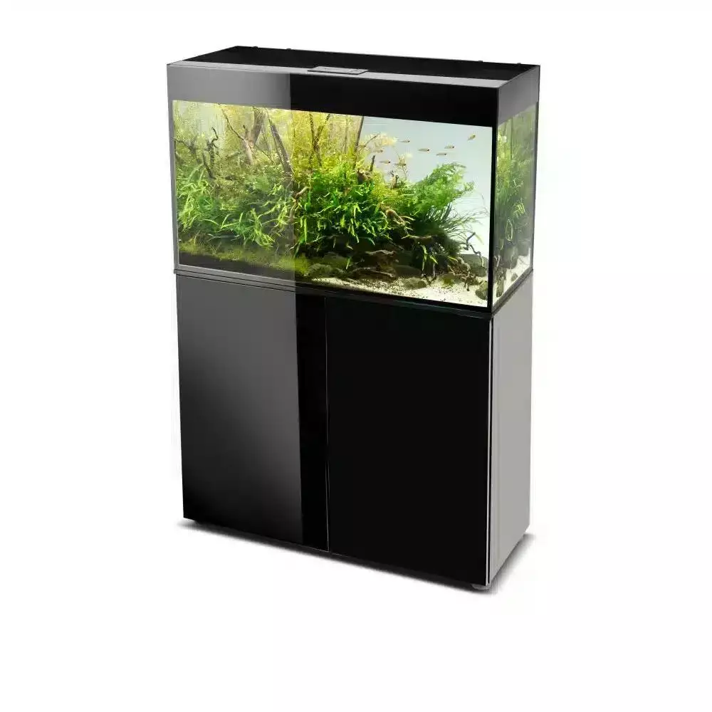 Glossy 80 on hyvin tyylikkään näköinen musta suorakaiteen mallinen akvaario jossa ei ole ulkonevia kehyksiä.