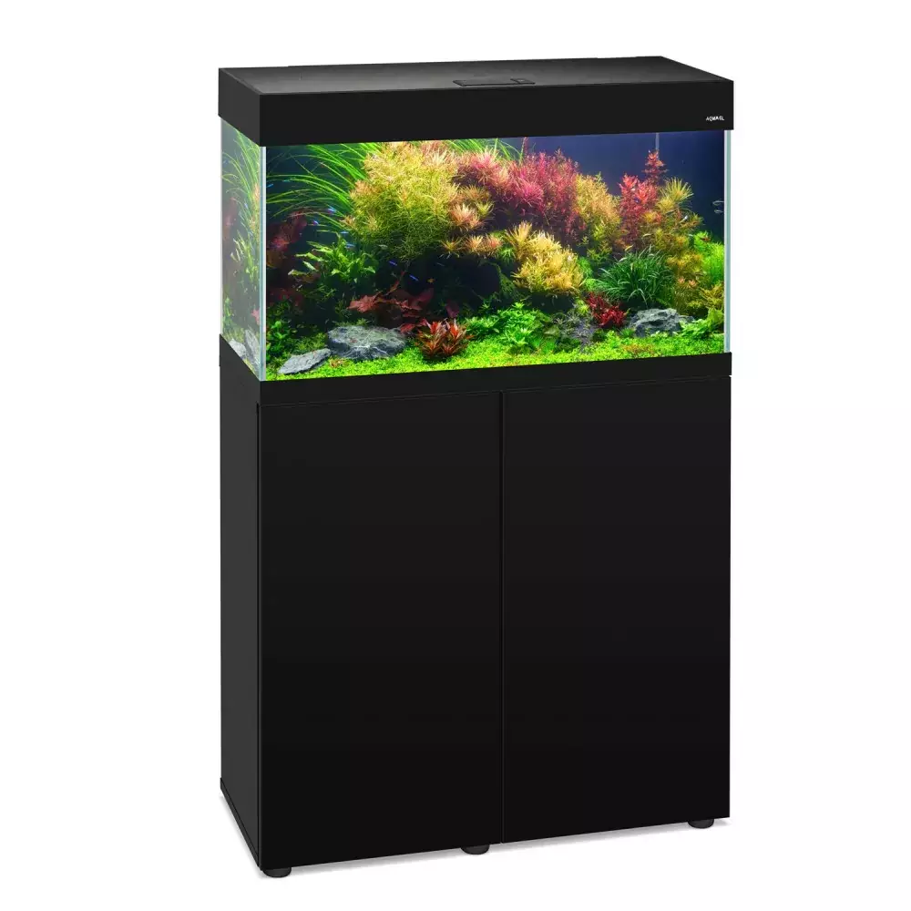 Optiset 125 paketti on hyvin tyylikkään näköinen musta suorakaiteen mallinen akvaario kokonaisuus.