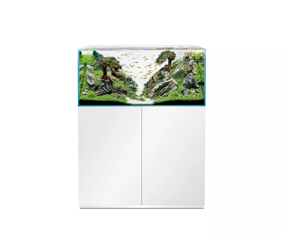 Akvaarion kaapisto on väriltään valkoinen ja siinä on kaksi ovea. Toisessa kaapissa on liukutaso ulkosuodatinta varten.