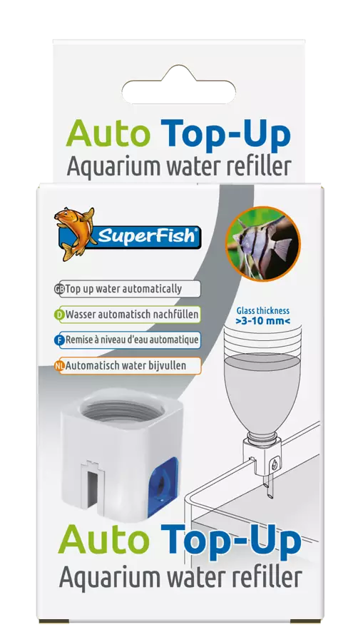 Laite kiinnitetään puhtaaseen muoviseen PET pulloon (esimerkiksi 1.5l limupulloon), joka täytetään 1 - 2 litralla vettä. Kun pullo on asennettu akvaarion reunaan, Auto Top-Up lisää haihtuneen veden automaattisesti takaisin akvaarioon. Tämä auttaa pitämään vedenpinnan vakaana ja tekee arjen hoidosta helpompaa.