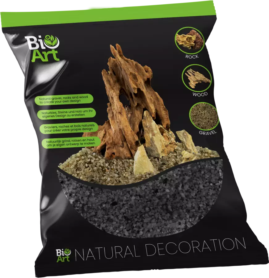 Hiekka sekoitus mustaa hiekkaa BioArt terraarioon. Luonnon hiekka saattaa sisältää pieniä määriä kalkkikiveä, joten hiekka saattaa nostaa veden pH arvoa.