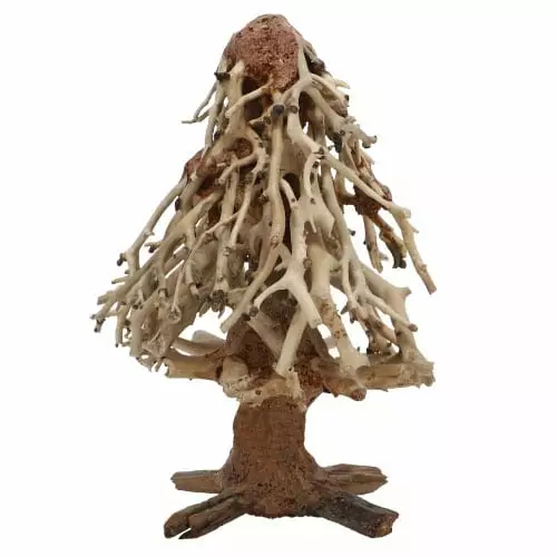 Joulukuusen näköiseksi tehty bonsaipuu joka on käsintehty useista pienemmistä puun kappaleista jotka on liimattu yhteen.