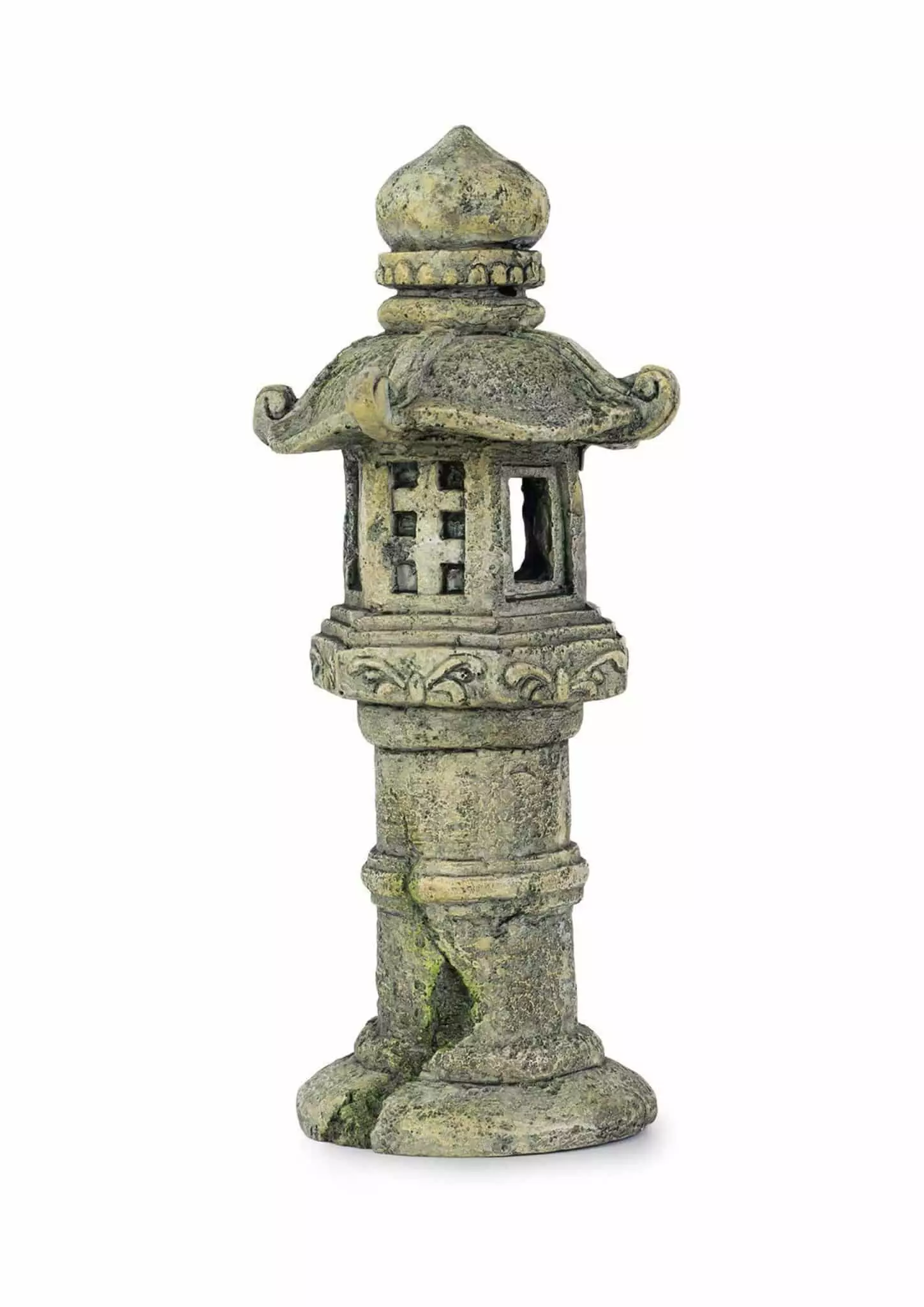 Muovinen majakan raunio koriste akvaarioon joka seisoo omalla jalallaan.
