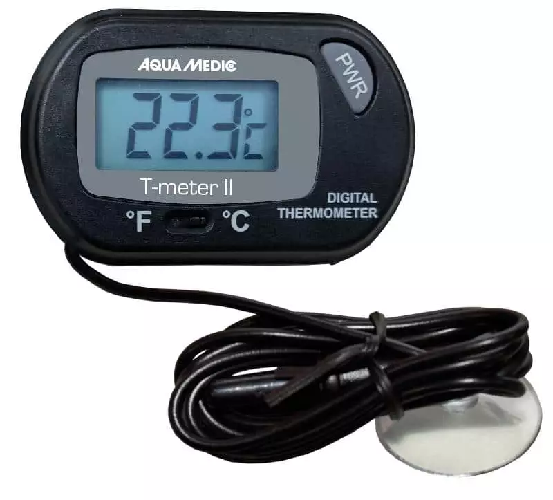 Digitaalinen lämpömittari asennetaan akvaarion ulkopuolelle ja sen anturi johto asetetaan veden alle haluttuun kohtaan imukupilla lasiin kiinni.