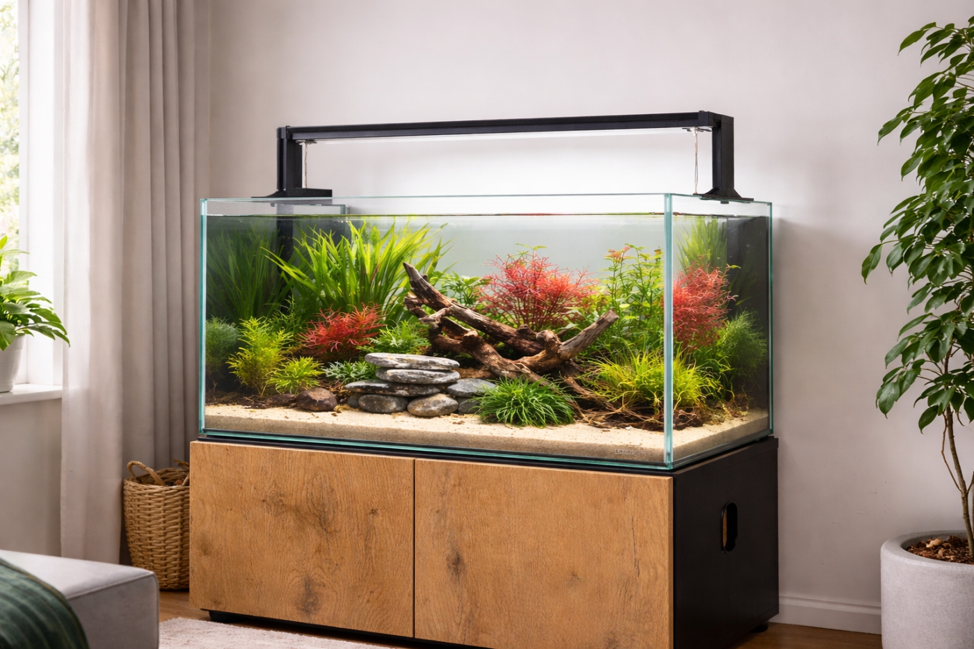 Oikein valittu tausta viimeistelee akvaarion ulkonäön ja sitoo sisustuksen yhtenäiseksi kokonaisuudeksi. Se on pieni, mutta vaikuttava yksityiskohta, joka kannattaa ottaa huomioon jo akvaariota perustettaessa – tai päivittää myöhemmin, kun akvaarion ilmettä halutaan raikastaa.