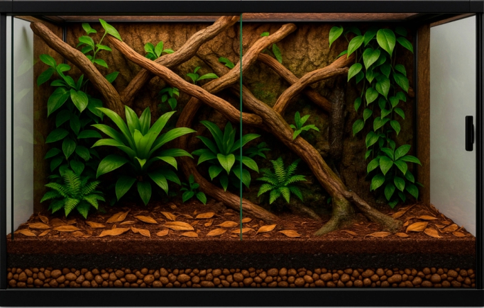 Bioaktiivinen pohja sademetsäterraarioon on luonnonmukainen ja itseään ylläpitävä alusta, jossa pieneliöt huolehtivat jätteen hajottamisesta ja kosteuden tasapainosta. Se helpottaa terraarion hoitoa ja tukee kasvien kasvua.