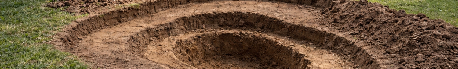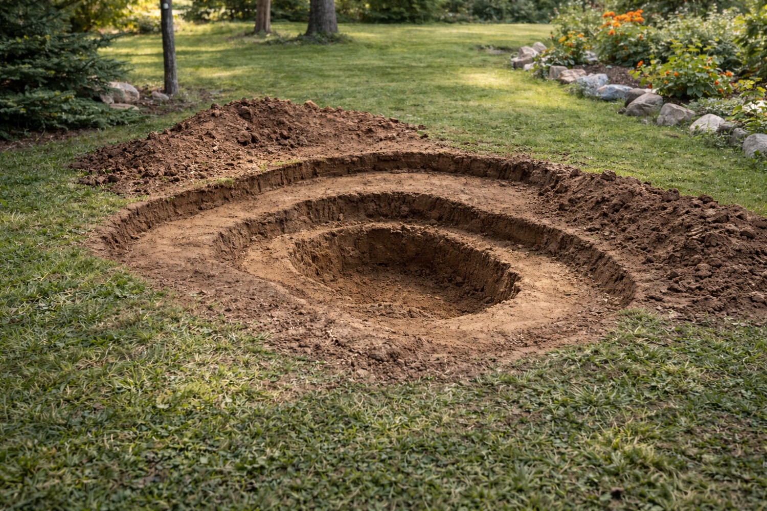 Tässä vaiheessa lammikolle on jo valittu paikka, joka on merkitty narun, puutarhaletkun tai köyden avulla. Merkinnöissä on otettu huomioon lammikon reunat sekä syvä alue - mahdollisesti myös eri vyöhykkeet on merkiitynä nurmikkoon. Kaiva ensin lammen uloin muoto ja etene sen jälkeen vähitellen syvemmälle. Muotoile syvyystasot (vyöhykkeet) loivasti porrastettuina, ei jyrkkinä pudotuksina. Näin rakenne pysyy vakaana ja pohjalle asennettava allasmuovi asettuu tasaisesti.