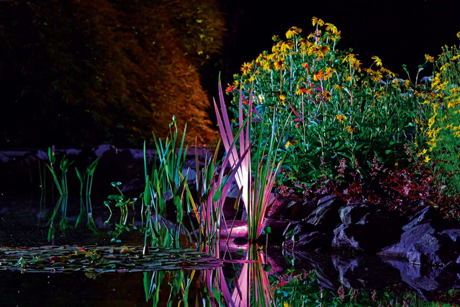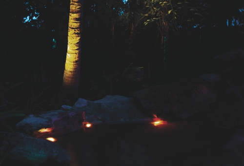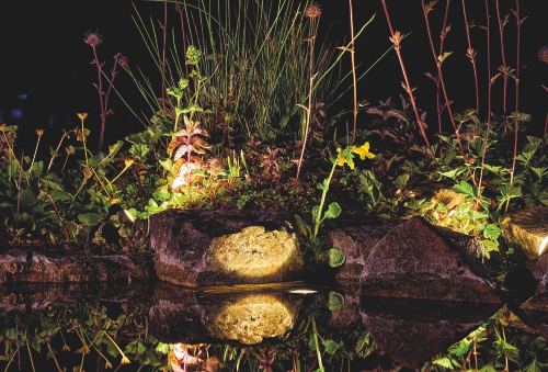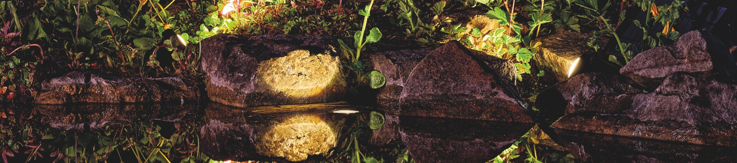 Valaisimet voidaan sijoittaa lammikon pohjalle, rantakivien väliin tai kasvien lomaan. Eri suunnista tuleva valo tekee kokonaisuudesta elävän ja tuo esiin veden pinnan liikkeen.