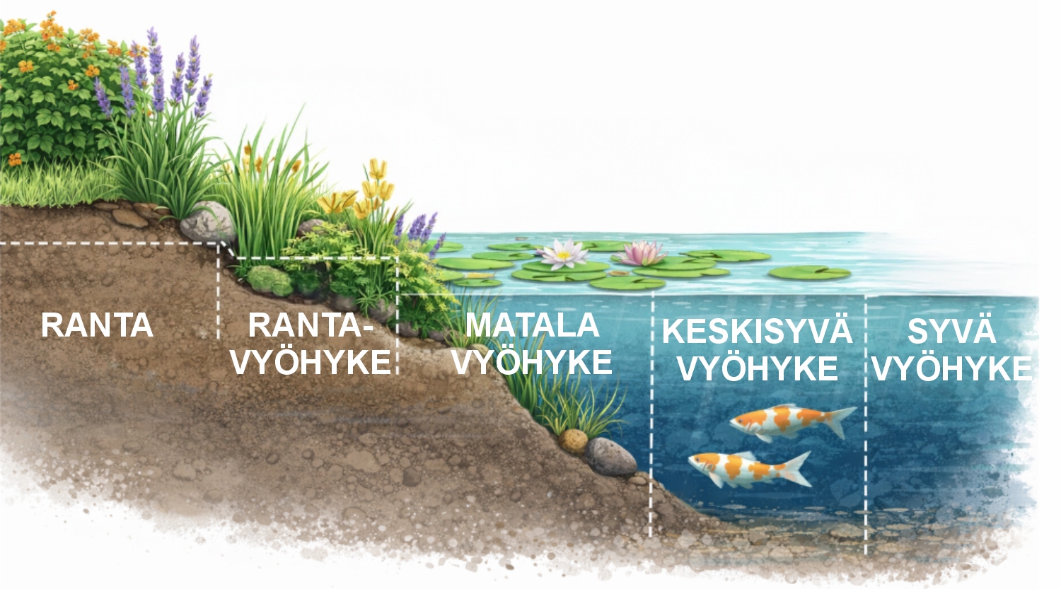 Hyvin suunniteltu puutarhalammikko rakentuu eri syvyysalueista eli vyöhykkeistä. Vyöhykkeet vaikuttavat veden laatuun, kasvien menestymiseen, kalojen talvehtimiseen sekä lammen yleisilmeeseen. Kun syvyysvaihtelut huomioidaan jo suunnitteluvaiheessa, lampi toimii biologisesti tasapainoisemmin ja näyttää luonnollisemmalta.
