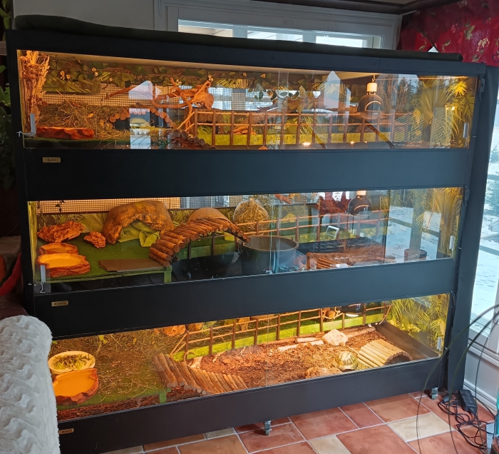 Jos terraarion rakentaa kokonaan itse, tai käyttää terrarioita, joita voi kasata päällekkäin ja muokata, voi maakilpikonnaterrariosta saada komean kerrostalonkin, kuten tässä UniTuvan esimerkissä.