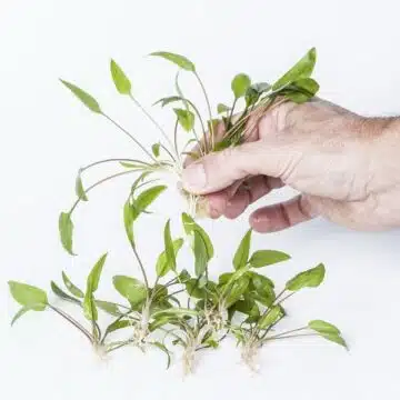 Istuta kasvit haluttuun paikkaan akvaariossa siten että jätät yksittäisten ruusukkeiden väliin tilaa noin 2 cm hyvin pieneksi jääville melalehdille ja suureksi kasvaville vähintään 5 cm.