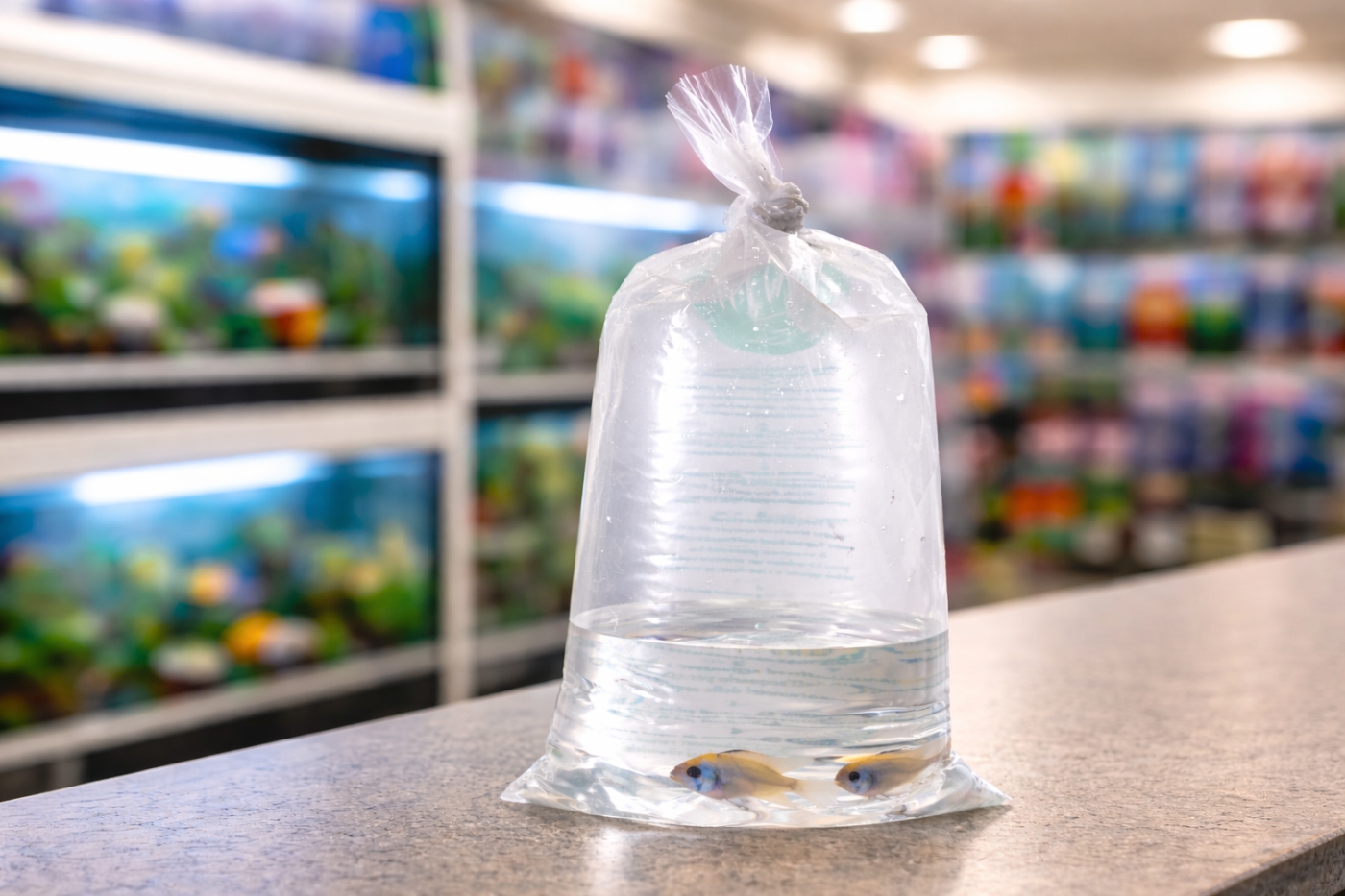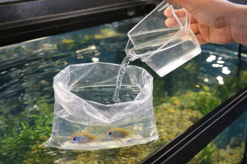 Kuljetuspussi asetetaan kellumaan akvaarioon noin 30 minuutiksi, jotta veden lämpötila tasaantuu. Pussi avataan ja sen reunat käännetään ilmataskuksi, jotta pussi pysyy kellumassa pystyssä. Pussin voi myös kiinnittää akvaarion reunaan esimerkiksi pyykkipojalla. Akvaarion vettä lisätään kuljetuspussiin vähitellen, esimerkiksi noin kahvikupillinen kerrallaan 5–10 minuutin välein. Tämä toistetaan useamman kerran, jotta kalat ehtivät sopeutua uuden veden ominaisuuksiin rauhallisesti. Jos kuljetusaika on ollut pitkä, vesi on selvästi jäähtynyt tai kyseessä on herkempi laji, kotiutukseen kannattaa käyttää enemmän aikaa.