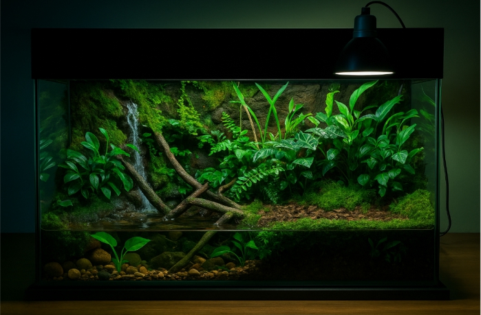 Valaisin sijoitetaan usein terraarion kattoon tai suojattuun valaisinpaneeliin. Valaistuksen kesto jäljittelee päivärytmiä – tyypillisesti 10–12 tuntia päivässä.