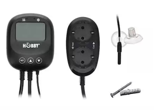 Termostaatti valvoo terraarion lämpötilaa ja kytkee lämmittimen päälle ja pois tarpeen mukaan. Se auttaa pitämään olosuhteet tasaisina ja estää ylikuumenemisen. Termostaatteja on erilaisia, kuten digitaalisia, analogisia ja usean lämmityslähteen malleja.