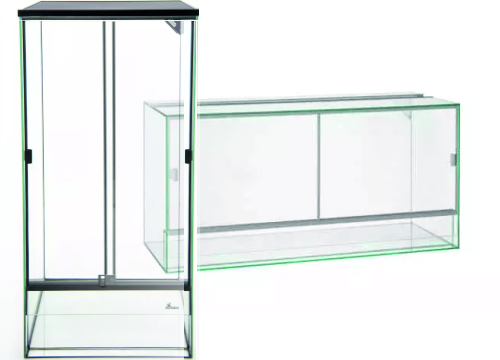 Lasiterraariot tarjoavat parhaan näkyvyyden ja soveltuvat erityisesti kosteisiin ympäristöihin. Niissä on usein hyvät ilmanvaihtoratkaisut ja mahdollisuus lisätä valoja ja sumutuslaitteita. Lasin etuna on myös helppo puhdistettavuus ja pitkäikäisyys.