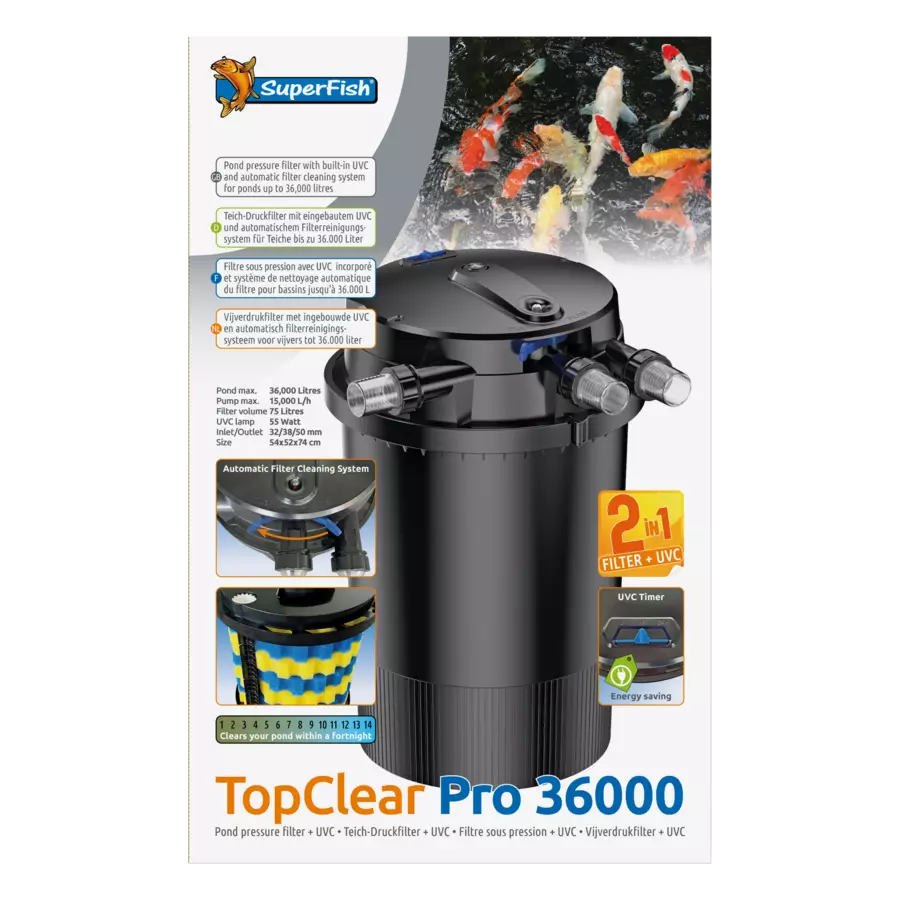Suodattimessa on sisäänrakennettuna 55w UV-C sterilisaattori. Sterilisaattorin päällä on myös kätevä pieni ikkuna josta näet että UV-C suodatus toimii normaalisti. Samoin yksikössä on sisäänrakennettu ajatsin, jolla voit säästää polttimon käyttöikää. Ajastimella voit asettaa sterilisaattorin olemaan 24/12/0 tuntia päällä päivässä.