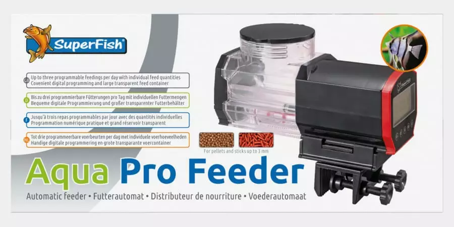 Ruokinta-automaatti akvaarioon. Väri: musta Voidaan asentaa akvaarion kannenpäälle, tai kiinnittää akvaarion lasiin. Ruokintaluukku avautuu vain silloin kun ruokaa tulee ulos, ei siis ruoan kostumis- ja homehtumisongelmaa. Suuri ruokasäiliö 200 ml