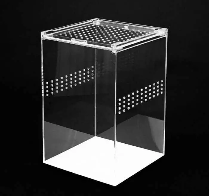 Pieni akryyli terraario aukeavalla kannelle esimerkiksi hämähäkin väliaikaiseen säilytykseen / kuljetukseen. Terraario on kooltaan 15 x 15 x 23 cm