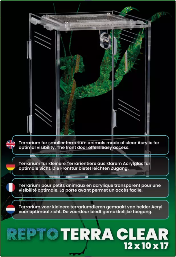 Repto Terra Clear on pienikokoinen akryyliterraario, joka soveltuu pienille terraarioeläimille. Terraarion yläosa on verkkopanelia joka parantaa ilmanvaihtoa ja mahdollistaa valaisimen asentamisen terraarion päälle.