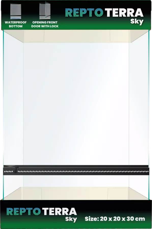 Repto Terra Sky 20×20×30cm – vedenpitävä pohja, ovi ja kokonaan avattava verkkokansi.